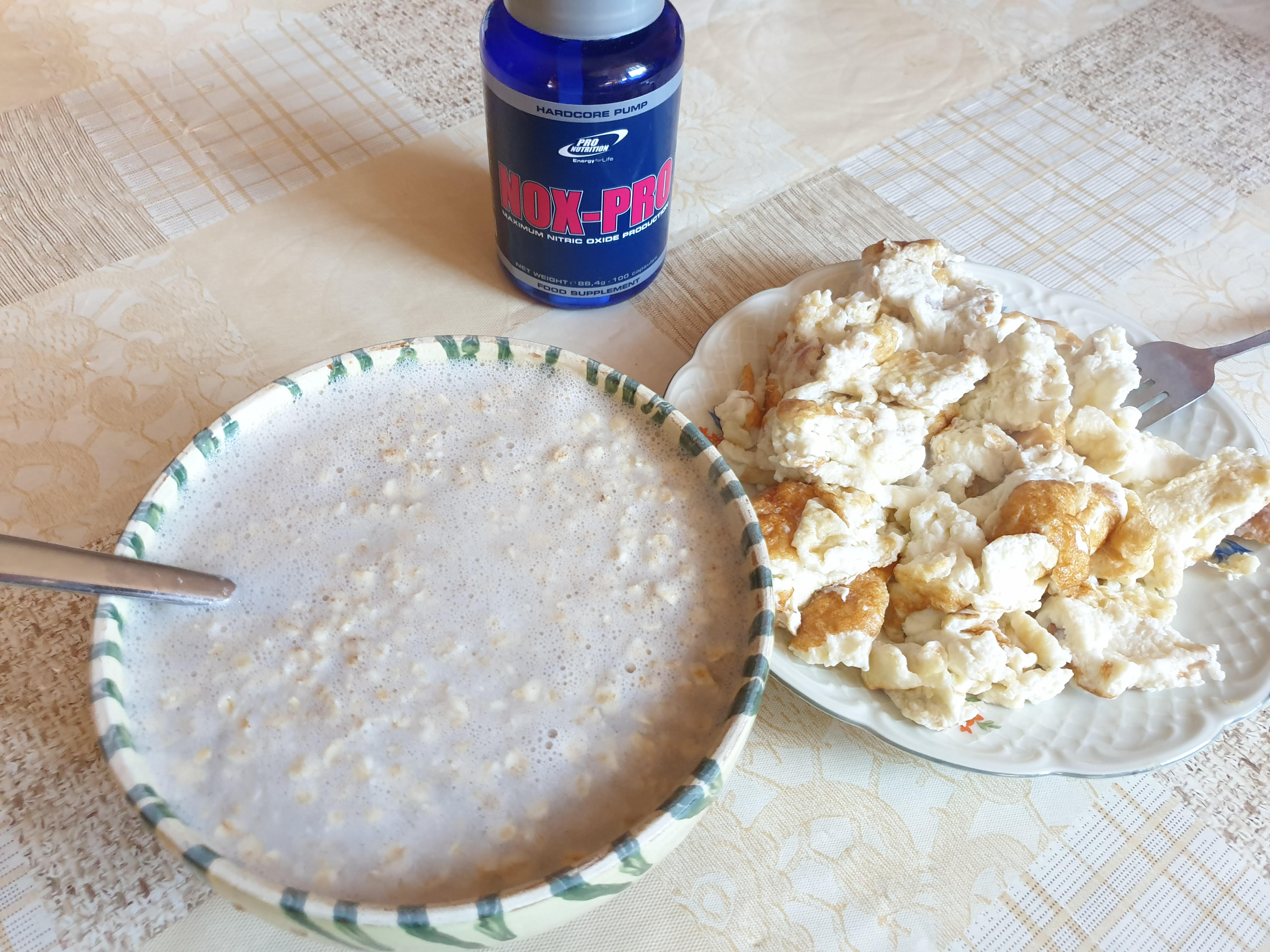 Masa 1: 100 grame fulgi ovaz, 1 ou intreg, 6 albusuri, 1 mar