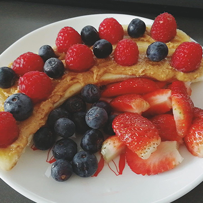 Smoothie: banana + nuci + miere + fructe de padure congelate + unt arahide